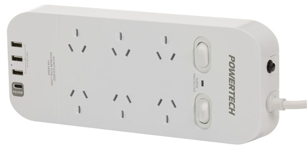 This 6-way powerboard features two switched rows of three sockets, surge and overload protection, two USB-A ports and one USB Type-C port with Power Delivery (PD) to charge your power hungry USB devices. It has a 1m long power lead. Gloss white in colour.