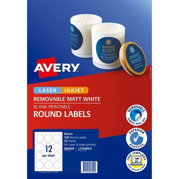 AVERY 980009 L7104REV REMOVEABLE BLANK PRINTABLE LABELS ROUND LASER/INKJET 12UP MATT WHITE PACK 10