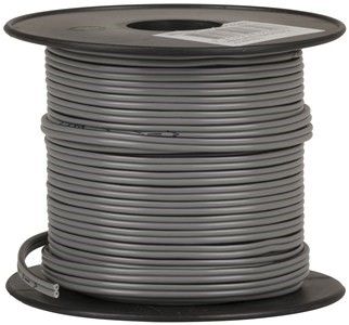 The WB1703 is a 30m roll of light duty speaker cable for small audio equipment and intercoms. It has a grey outer insulation and black trace for polarity identification.