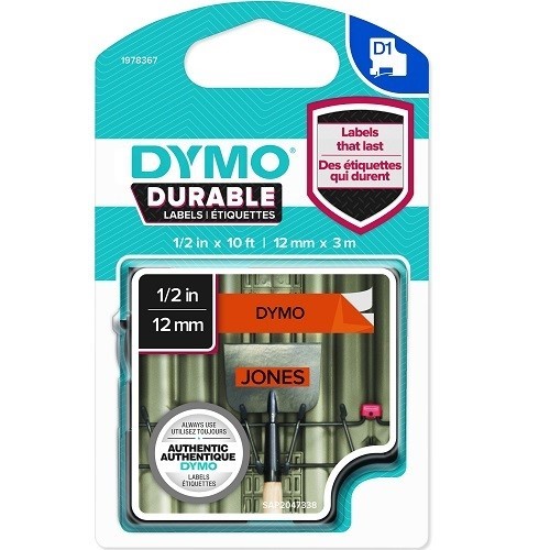 DYMO 1978367 D1 DURABLE LABEL CASSETTE TAPE 12MM X 3M BLACK ON ORANGE