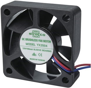 The YX2504 is a compact air volume device with noise levels at 33dbA. It features a plastic, fibreglass filled housing and impeller, consumes 2.28 watts and has a current of 0.19. The air volume capacity is 0.7 m3/min or 16.6 CFM.