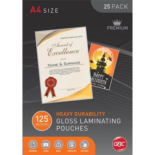 GBC laminating pouches provide superior document protection. Featuring the highest quality materials GBC pouches are crystal clear with a high gloss finish - When used with a laminator, these pouches encase your document in a smooth layer of laminate