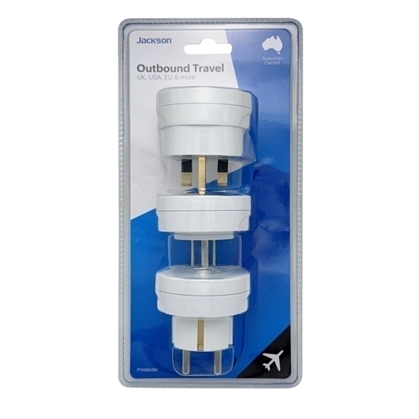 The Jackson Outbound Slim Travel Adapter enables Australian appliances to function in over 150 countries, featuring three outbound adapters for the UK, Europe, and the USA. It comes with a lifetime warranty*. Model PTA8809M supports 110VAC 10A 50/60Hz, while models PTA8810M and PTA8811M support 220-240VAC 10A 50/60Hz.