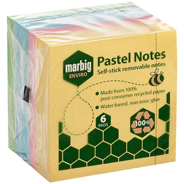 MARBIG ENVIRO REPOSITIONAL NOTES 100 SHEET 75 X 75MM PASTEL PACK 6