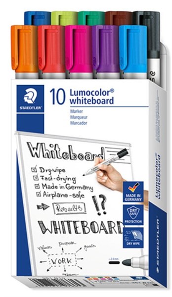 Staedtler 351 Lumocolor whiteboard marker can be dry-wiped from whiteboards and surfaces like glass and porcelain without leaving a trace - Fast-drying, low odour