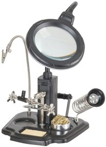 The TH1989 multi-purpose tool is perfect for small to medium PCB work, soldering, and more. It includes a magnifying lamp with a 3rd hand, a soldering iron stand, alligator clips, and more. It's powered by 4 AA batteries and has a 90mm magnifying glass lens with 3x magnification.