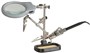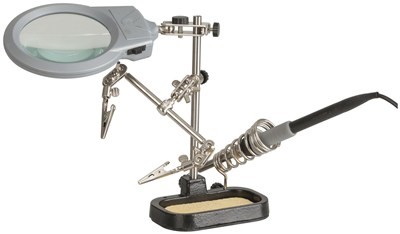 TH1987 is a great tool for soldering, model making and other applications where a helping hand is needed. Equipped with a magnifying glass and two LED lights, it allows for an excellent view of your work. The alligator clips are adjustable and the cast iron base adds stability. Its powerful alligator clips hold the board as you solder. The soldering iron holder is also included. TH1987 runs on 3xAAA batteries.