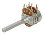RP3706 is a potentiometer with a genuine 6.35mm shaft and a flat machined surface for grubscrews or knob mounting. The shaft is 38mm long and the bush is 3/8 32 T.H.D., which is great for fixing to a panel. The pot has PCB mount capability and its pins are rigidly mounted on phenolic with the center pin being offset from the two outer terminals. The pot is held in 6 places and requires no extra mechanical mounting assistance. The pins are large enough to terminate screened cable, etc. The pot has a power rating of 0.5W max and a value of 10K.