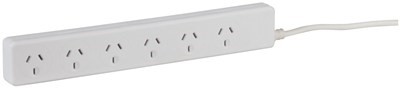 The MS4045 power board allows 6 appliances to be plugged into one power point, with a maximum load of 2400W. It includes a safety overload with reset switch, has a white color, cord length of 0.9m, and a power LED indicator. It operates on 240V mains power.