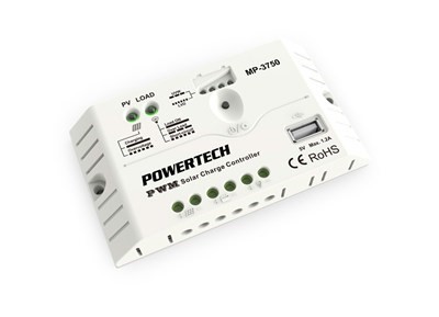 Introducing the MP3750 solar controller with a one-year warranty and USB 2.0. Using Pulse Width Modulation (PWM), it controls battery charging with total autonomy and important safety features such as overload, short-circuit, over-discharge and reverse-polarity protection. It comes with a USB port for charging devices with 1.2A output for added convenience. It can charge sealed led acid, Gel and flooded cells, and automatically switches to the best charging mode. The MP3750 is suitable for 12V and 24V battery banks.
