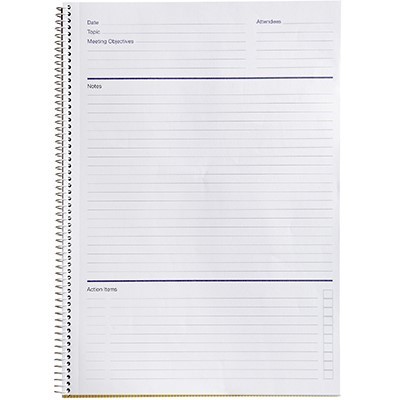 - Template includes date, topic, attendees, objectives, notes and action