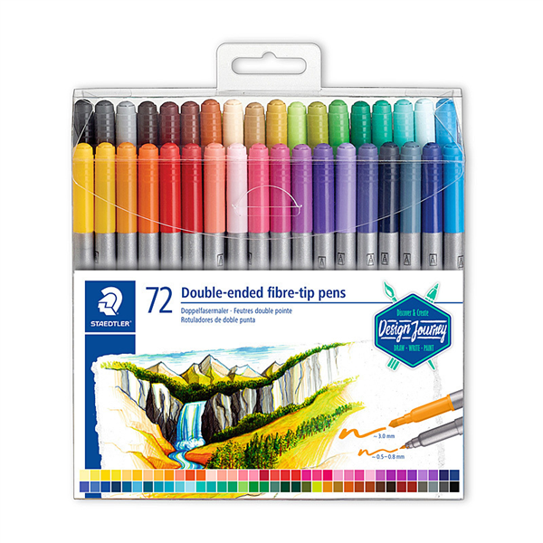 Staedtler 3200 Double Ended Fibre Pen Asst Wlt72 is designed for professional use in coloring, drawing, and writing, featuring dual tips for versatile application. The pen includes a fine nib for precise lines ranging from 0.5 to 0.8 mm and a broad nib for bolder strokes up to 3.0 mm. Key features include: