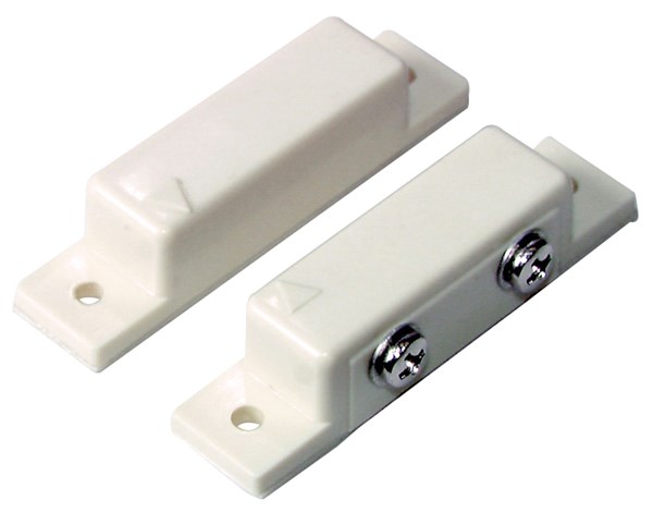 LA5072 is a pair of magnetic contacts used to secure an alarm circuit on doors or windows. They have powerful magnets with screw or self-adhesive mounts and screw terminal connections. The contacts work with a reed switch and magnet, with closed contacts when together and open when apart. They are sold as a pair and are normally closed.