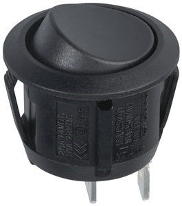 The SK0960 is a black button switch with a black actuator that snap fits into a 20mm round hole. It can handle 10 amps at 125VAC or 6 amps at 250VAC and has Q.C. tab termination.