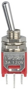 The ST0310 is a subminiature switch with a solder tag and threaded bush design. It has brackets to indicate its on-on switch position, and has an operating temperature range of -30;C to +85;C. Rated at 1Amp @ 250VAC for the subminiature size and 2Amps @ 250VAC for the miniature size with resistive load, it can handle 3Amps @ 28VDC for subminiature and 5Amps @ 28VDC for miniature. It is made of Diallyl Phthalate (DAP) case material and has a brass, chrome-plated toggle handle, nickel-plated brass bushing, stainless steel housing, and brass, electro-tin plated switch support components. The contacts can either be fixed and moving with silver-plated over copper alloy or gold-plated over nickel-plated alloy.