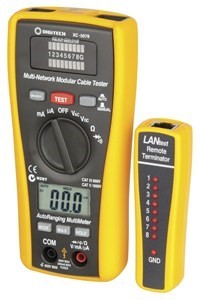 XC5078 is a multi-functional device ideal for network installers, technicians, and users to check cable integrity, measure AC/DC voltage and current, resistance, and continuity. It enables the user to check for cable continuity, open-circuits, short-circuits, and cross-connects etc. The kit includes a remote terminator, loop back cable, LAN terminator, and multimeter leads. The LAN tester checks for faults and miss-wired conductors with manual or automatic testing.