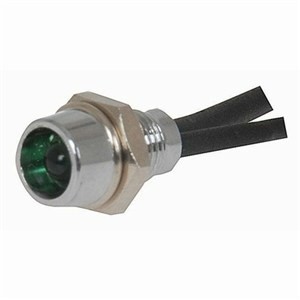 The SL2646 is a chrome-cased LED with a green 3mm bulb. It requires a 5mm hole cutout and comes with 100mm fly leads. An alternative version, the SL-2647, has a red LED and 24V power supply.