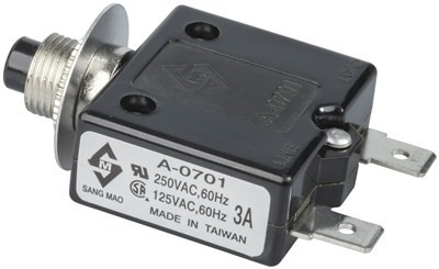 SF2252 is a rugged circuit breaker designed for both AC and DC circuits with current ratings ranging from 3A to 25A. The breaker has excellent current holding ability at 25;C and can withstand higher temperatures with derating. It features a manual push-to-reset mechanism, high insulation resistance, and a 12mm mounting hole diameter.