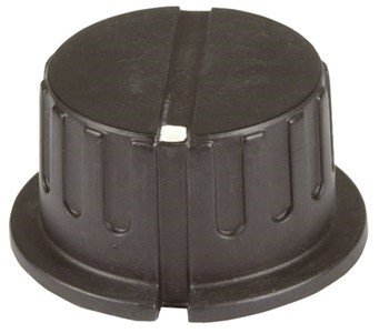 The HK7766 is a plastic knob with a 1/4" shaft grubscrew fixing. It features a modern fluted style with a slot for a pointer and a small skirt.
