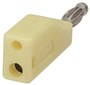 The PP0383 banana plug features a piggyback style allowing another plug to be inserted into its back, and it comes in 5 colors to match binding posts. Specifically, the color of the plug being described is yellow.