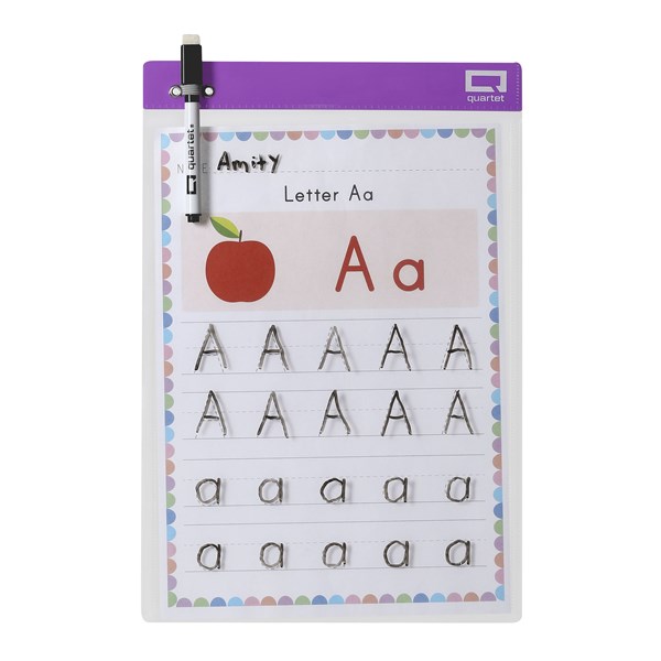 Practice makes perfect. The Quartet Flex Dry Erase Sleeves can help students learn with their own individual writing sleeves that are interchangeable to many different educational templates therefore saving money on paper and ink! Perfect for use in classroom setting, allows for multiple uses Magnet on the back allows dry erase sleeve to stay securely on a magnetic whiteboard Paper can easily slip in and out Made of PP material Pack of 10 sleeves and markers