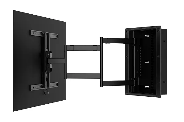 Transform your viewing experience with the Sanus Full-Motion TV Mount. Designed for TVs from 42 to 85 inches, this mount lets you effortlessly position your screen for the perfect angle, whether you're in the kitchen or across the room. Its FluidMotion technology ensures smooth, easy adjustments, while the Slim FollowThru system keeps cables tidy and out of sight. When you're done, it sits a mere 0.5 inches from the wall for a clean, minimalist look. We know how important it is to have a setup that's both functional and looks great in your home, and this mount delivers. Plus, with six attachment slots and included velcro, you can even secure small components. The in-wall box is designed to fit standard 16" on-center studs, making installation a breeze for our customers who appreciate straightforward, quality solutions.