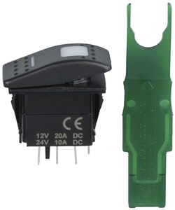 The SK0914 is a rocker switch commonly seen in luxury motor cruiser cockpits, but can also be used in 4WDs, RVs, caravans, and other applications. The switch comes with a double-LED illumination and includes a standard rocker cover and a range of decals for customization. Special laser-etched covers are also available for a more professional finish. The switch is available in white, red, blue, and orange and compatible laser-etched covers include symbols for power, fridge, auxiliary battery, camper power, spot lights, horn, and rear view camera.