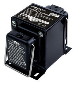 The MF1080 is a stepdown transformer that comes with a 1 year warranty and can handle up to 120 Watts of power. It's a fully-enclosed and compact unit that features fold-up carry handles, an approved 3-wire power cord, a US-style 3-pin socket, and protective earth carried through to the output. It's suitable for use with precision electronic and electric appliances, has a steel case construction that makes it both robust and safe, and includes a resettable circuit breaker instead of a fuse.